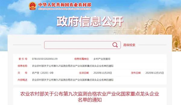 12月15日,農(nóng)業(yè)農(nóng)村部發(fā)布《關于公布第九次監(jiān)測合格農(nóng)業(yè)產(chǎn)業(yè)化國家重點龍頭企業(yè)名單的通知》。