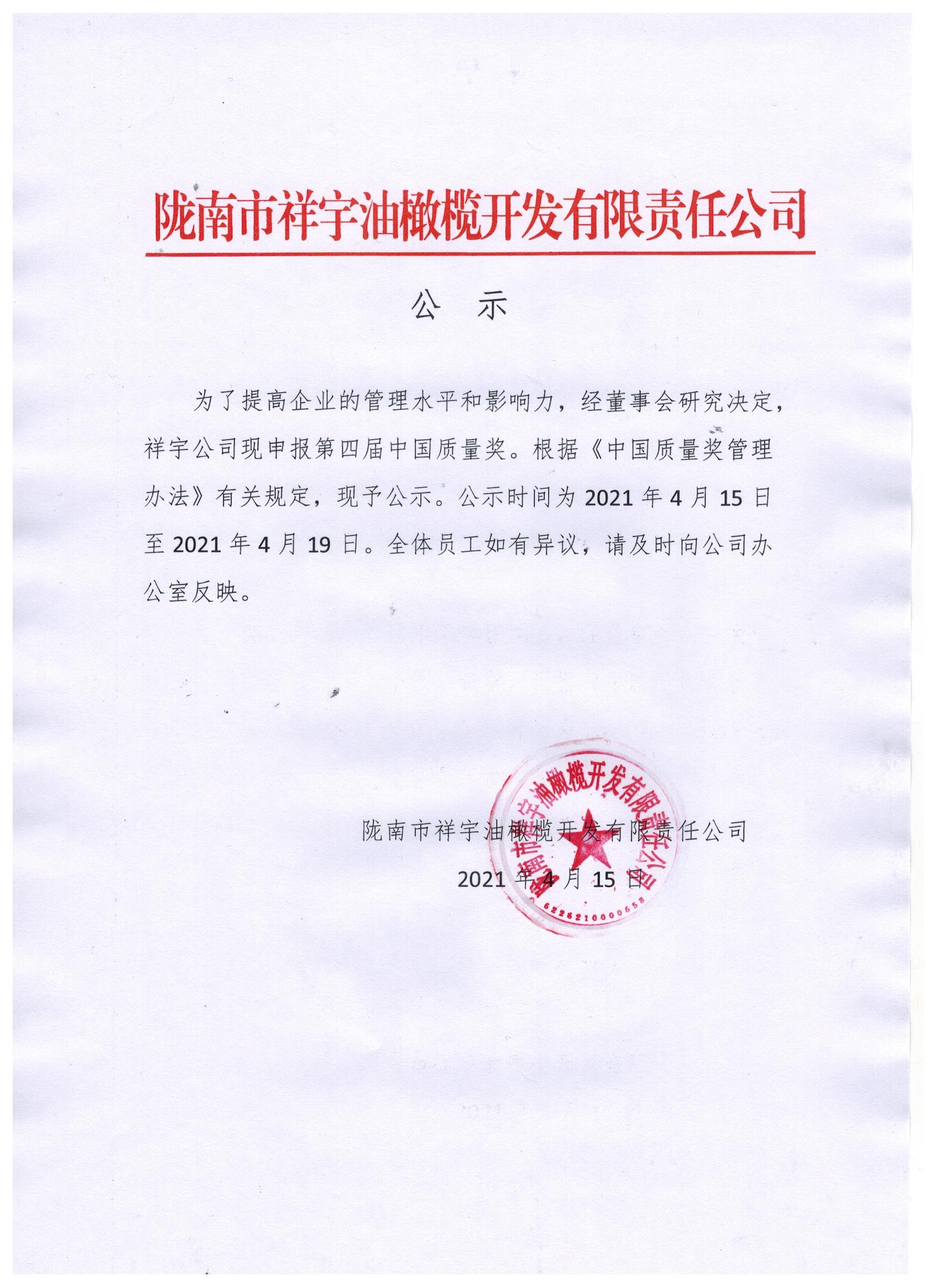 隴南市祥宇油橄欖開(kāi)發(fā)有限責(zé)任公司關(guān)于申報(bào)第四屆中國(guó)質(zhì)量獎(jiǎng)的公示